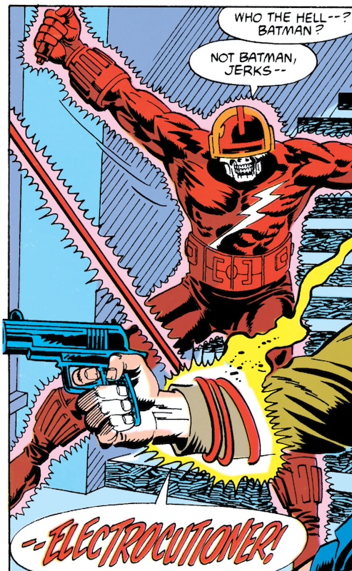 Picking up shortly after Batman #459, the news of Commissioner Gordon’s cardiac arrest shocks the city. Sarah Essen watches over Gordon in the hospital. Batman also makes sure Gordon is okay. Meanwhile, a new (one-shot) Electrocutioner debuts by killing a bunch of thieves (but curiously leaves one witness alive). Batman, Dana Hanarahan and Sarah Essen examine the crime scene. Later, at GCPD headquarters, a vulture-like police official named Haney, gunning for Gordon’s job, pleads his case to the campaigning incumbent mayor of Gotham, Julius Lieberman. (While not specifically named, this is the first comic book appearance of Lieberman. We know this is Lieberman because he will definitively appear in two upcoming arcs.)[4] Batman targets the Uptown Mob only to run into the Electrocutioner, who does the same schtick as before, killing several crooks but leaving one alive. Batman soon realizes that the Electrocutioner has been hired by a mafia consortium to execute specific gangsters that have violated the relative mob truce that has been in existence since Tony Zucco’s death. After some quick research, Batman deduces that the Electrocutioner will target Enrico Valdez (a mobster that stole from another mobster) at the hospital. Batman dons his electric-proof costume and phones the hospital, warning them to move both Valdez and Gordon to safety. Hiding in Valdez’s room, Batman gets the jump on the Electrocutioner, taking him down while also saving Gordon, who hadn’t been moved.