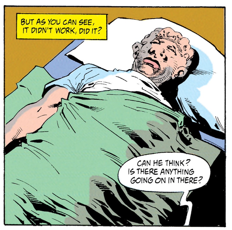 Picking up directly from Batman #486 and our previous Batman #497 flashback bridge-sequence, the badly injured Batman stumbles up the stairs from the Batcave into Wayne Manor above. In the morning, Bruce sees Dr. Morris Gribbens and has some tests done. Meanwhile, from behind bars, gangster Vincent Morelli confers with his underling Johnnie, putting a hit out on Commissioner Gordon. Thus begins what we are told is a week of total inactivity from Batman while he rests and tries to recover. There’s really not room for such a break on our tightly-compressed timeline, but if you want to include this, that’s up to your own personal headcanon.