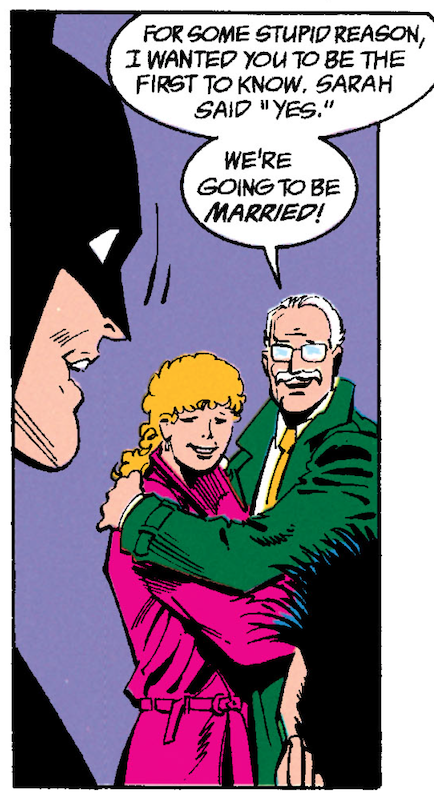 –REFERENCE: In Batman #487 Part 2. Jim Gordon and Sarah Essen get married! It’s unclear if Batman is directly involved with the wedding, but he’d definitely know about it either way. Notably, Batman: Legends of the Dark Knight Annual #2 (1992) depicts their marriage, but it’s out-of-continuity because it contradicts Arnold Flass’ death in Dark Victory (1999-2000). Some online sources have tried to do unique retcons of LOTDK Annual #2, splitting it up so parts of it can be included in earlier areas of the chronology, but that seems like taking extreme liberties with the urtext and really doesn’t make much sense. Because LOTDK Annual #2 is definitively out-of-continuity thanks to Dark Victory, the first canonical mention of Jim and Sarah’s nuptials is in Batman #487 Part 2 (which originally took place immediately after LOTDK Annual #2 anyway).