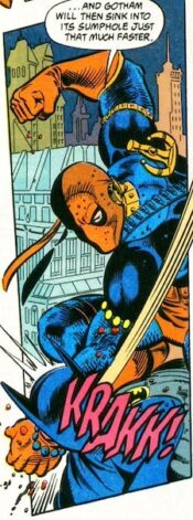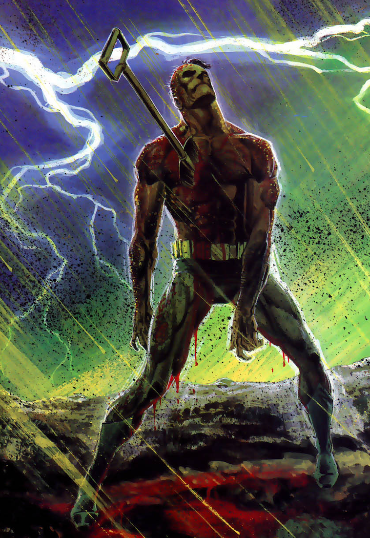 Thanks to a secret deal with Arkham Asylum’s cleaning company, Abattoir proves he can pretty much come and go whenever he wants. Believing an ancient cult ritual can give him ultimate power, the mentally-compromised Abattoir plans on killing 2000 birds, 4000 cows, and 6000 humans. Sure enough, the escaped villain kills thousands of birds at both Penguin’s old hideout and the aviary in Wayne Tower (aka the Wayne Foundation Building). A longtime Wayne Enterprises employee (who knew Bruce’s father) is also killed. Soon afterward, Abattoir begins slaughtering bovines and workers at a dairy. Batman intervenes, but Abattoir escapes. Later, Batman prevents Abattoir from derailing a passenger train and then busts him.