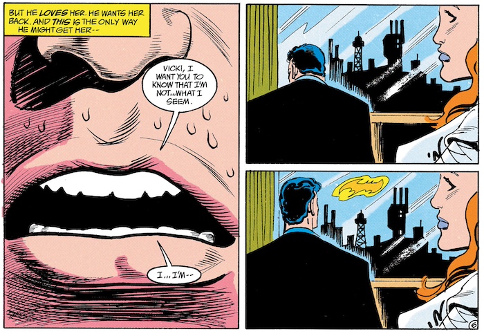 –REFERENCE: In Batman #465. Bruce and Vicki finally elevate their relationship and begin dating more seriously.