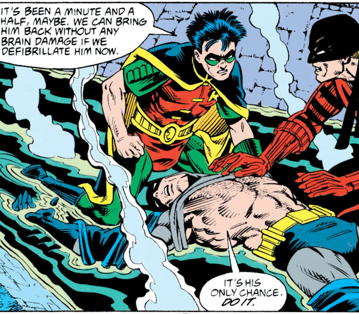 –FLASHBACK: From Batman #497. Picking up immediately following Batman #486, Alfred and Robin help the injured Batman (following his battle against Metalhead in the cemetery) into the Batcave. Although he can barely stand on his own, Batman prepares to ascend the staircase up to Wayne Manor.