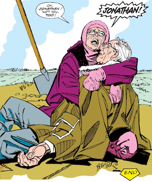 December—part of the ongoing “Funeral For a Friend” arc. It’s taken a little time to organize Superman’s public funeral ceremony, but the event is now ready to be held. At the far end of the galaxy, K’Raamdyn tells a stunned Lobo that Superman is dead. In Metropolis, literally all the superheroes attend the funeral service, which includes a parade. Batman, along with hundreds of thousands, mourn Superman’s passing. Present are Allie the Daily Planet intern, Bibbo Bibbowski, and Mildred Krantz. Watching from the sewers are Superman’s mutant pals Charlie Dawson, Stretch, Grub, and an unnamed snail man. (A bunch of Project Cadmus-created mutants, collectively known as Underworlders, reside underneath Metropolis.) Also pictured are the Forever People, but, thanks to retcons, this is a continuity error and they should be ignored. During the funeral parade, Batman stops a terrorist bomber while Robin stops bad guys from hurting Jimmy Olsen. When the swarming crowd breaks out into a riot, Wonder Woman and Hal Jordan corral them. Guest speakers are Lex Luthor, the new President of the United States, and the new First Lady. (Since this issue was originally published in February 1993, the latter duo is depicted as Bill and Hillary Clinton. However, due to sliding-time retcons, the correct POTUS and First Lady should be George W Bush and Laura Bush.) After Superman’s burial, a depressed Lois phones Ma and Pa Kent, who were too sad to come.